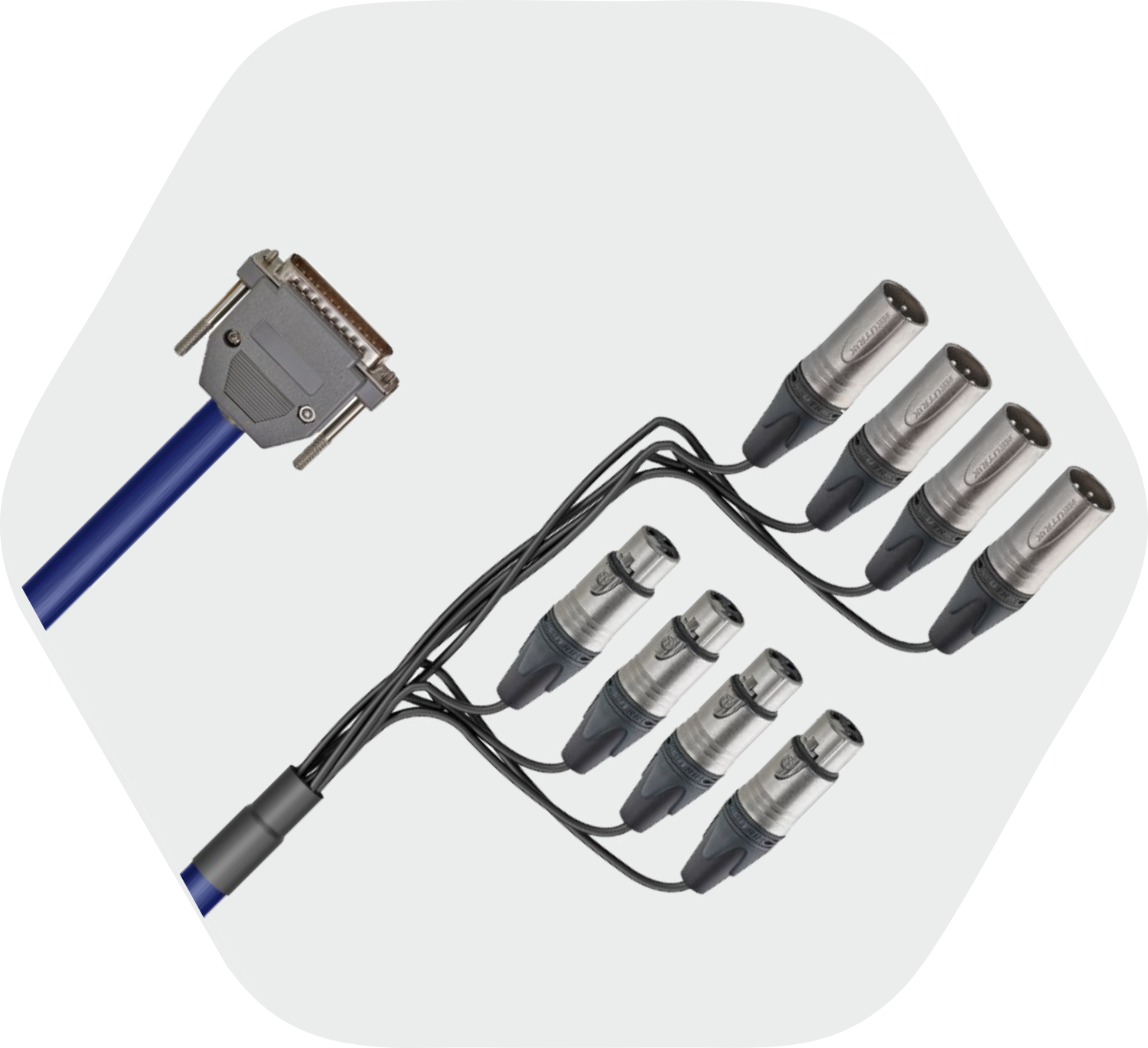 Длина: от 50 см Цвет кабеля: Черный Комплектующие: Разъем 1: Harting D-SUB 25 Коса 2: 4 х Neutrik NC3FXX; 4 х Neutrik NC3MXX; Кабель: Мультикор цифровой AES/EBU, Canare DA202F-8P